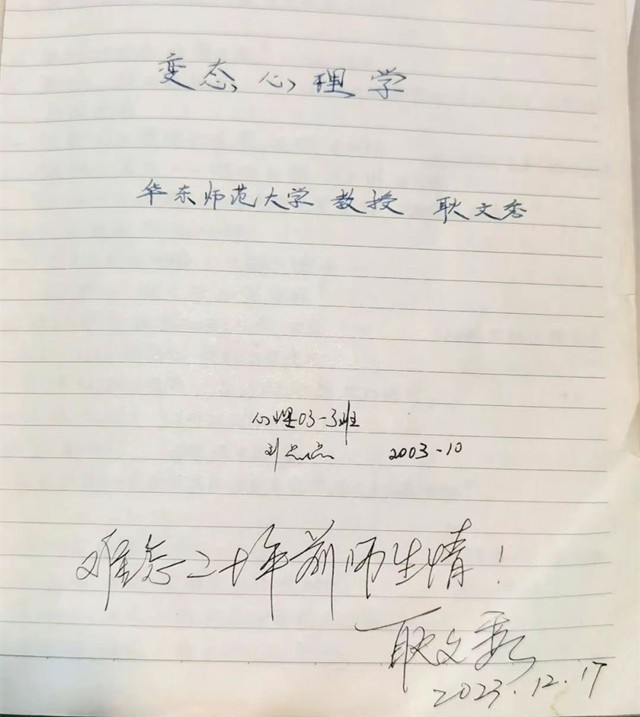 2023年12月17日,耿文秀受邀赴新疆师范大学讲学,她20年前在新疆师大支教时的学生,如今是新疆师大学生工作部(处)副处长的刘晶晶带上当年的课堂笔记请耿老师签字,“耿老师的博学、严谨、奉献、乐观,就是最好的生命教育”,刘晶晶说,一晃二十载,讲堂再相聚,能再听老师娓娓道来,倍感幸福。
