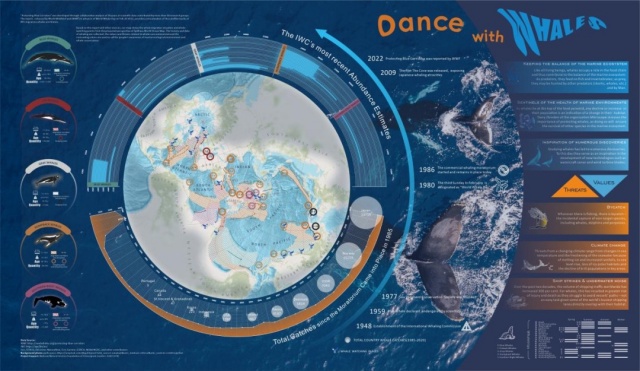 面对多元复杂时空专题信息集成表达和有效传达的难题,学生团队大胆尝试采用日益受到国际关注的Spilhaus世界海洋投影作为主体架构;另一方面,基于GeoInfographics模式进行图面组织,通过隐喻“风险”和“保护”的双色配色方案建立视觉冲突,并以同心圆阶梯状的视觉层次引导叙事流线,清晰展现出全新鲸类视角下的地球生态版图。