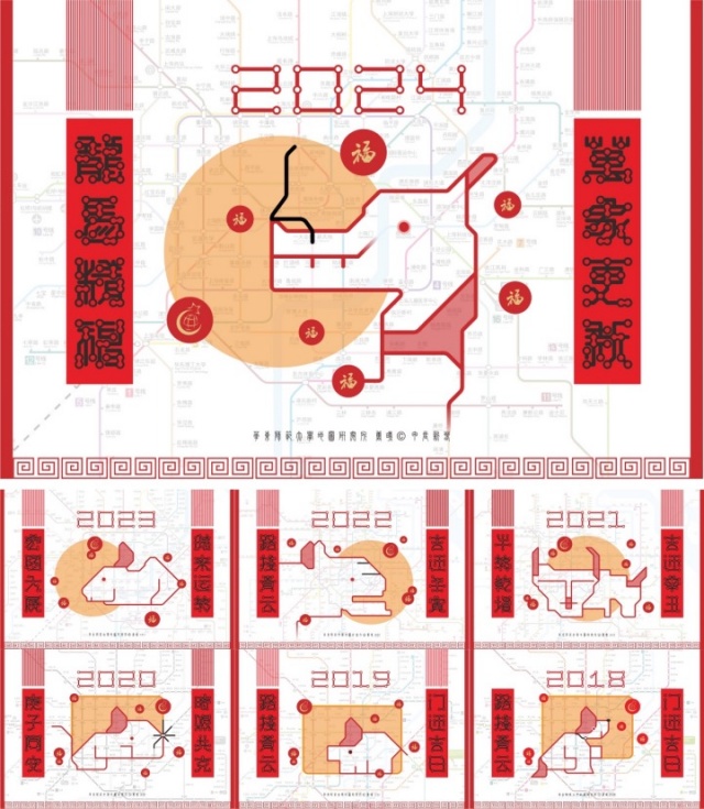 这是唐曦从2018年依据地铁路网图绘出“中华田园犬”开始的一场“较真”,之后的每个生肖,他都成功从中找到。小小创意,既是这7年来“贺新春”的保留节目,也成为了每年春季学期《地图学》课程最为特别的打开方式。