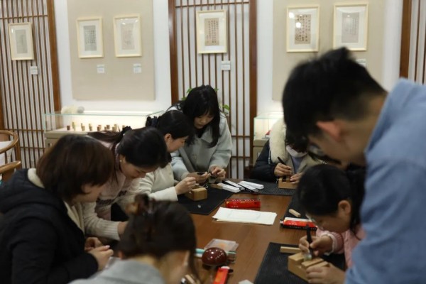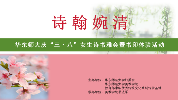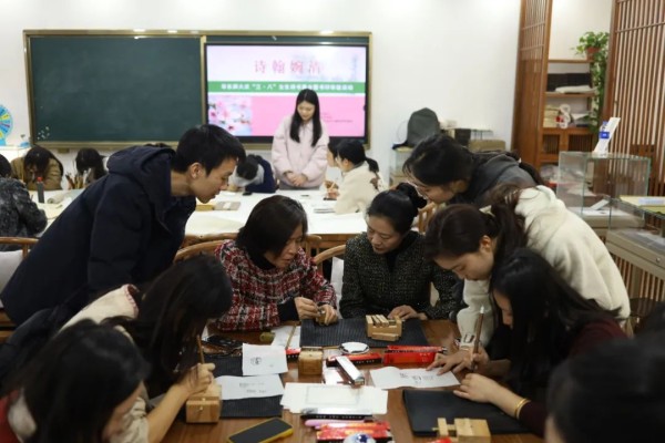 为了弘扬中华优秀传统文化,庆祝三八妇女节,践行大学美育,彰显女性人文气质,由beat365英国官网网站妇委会、beat365英国官网网站美术学院、教育部中华优秀传统文化(篆刻)传承基地主办,美术学院书法系承办的诗翰婉清——beat365英国官网网站庆“三·八”女生自作诗书法展暨师生书印体验活动于2024年3月8日下午在篆刻基地工作坊开展。