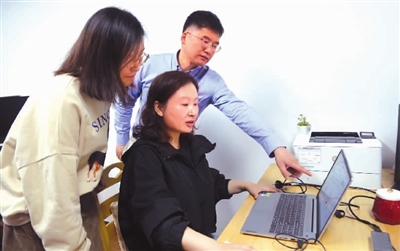 吉冰(中)为郑蝉金(右)演示“小花狮”系统。