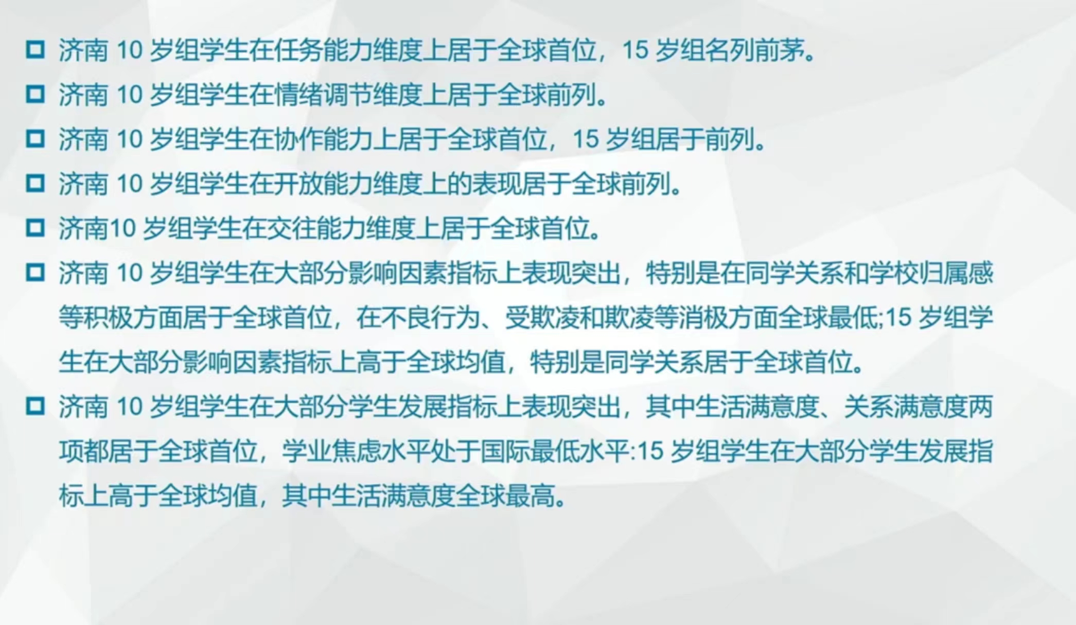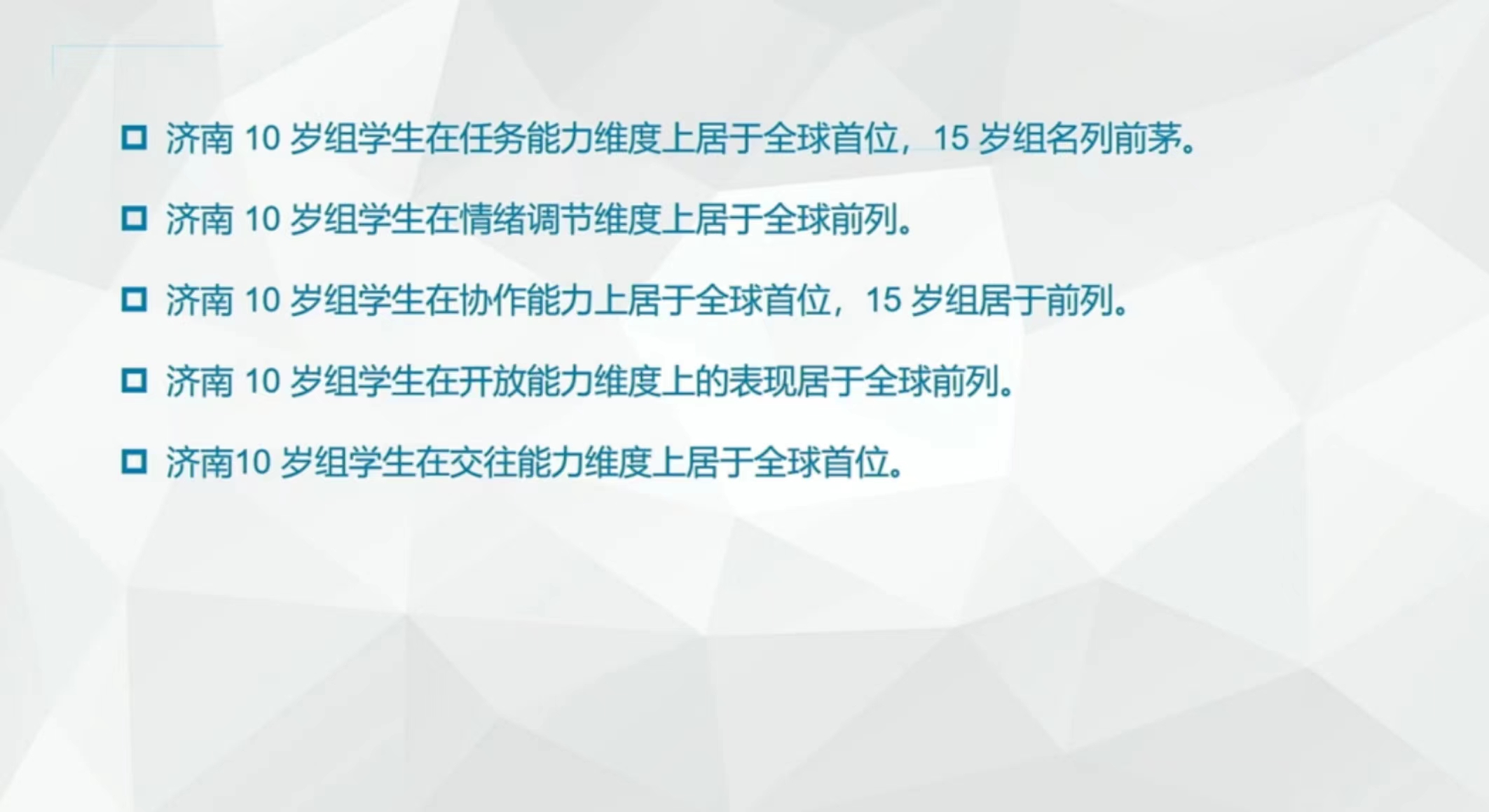 根据中国济南学生的测评显示,济南10岁组学生在任务能力维度上居于全球首位,15岁组名列前茅。济南10岁组学生在情绪调节维度上居于全球前列。济南10岁组学生在协作能力上居于全球首位,15岁组居于前列。济南10岁组学生在开放能力维度上的表现居于全球前列。济南10岁组学生在交往能力维度上居于全球首位。