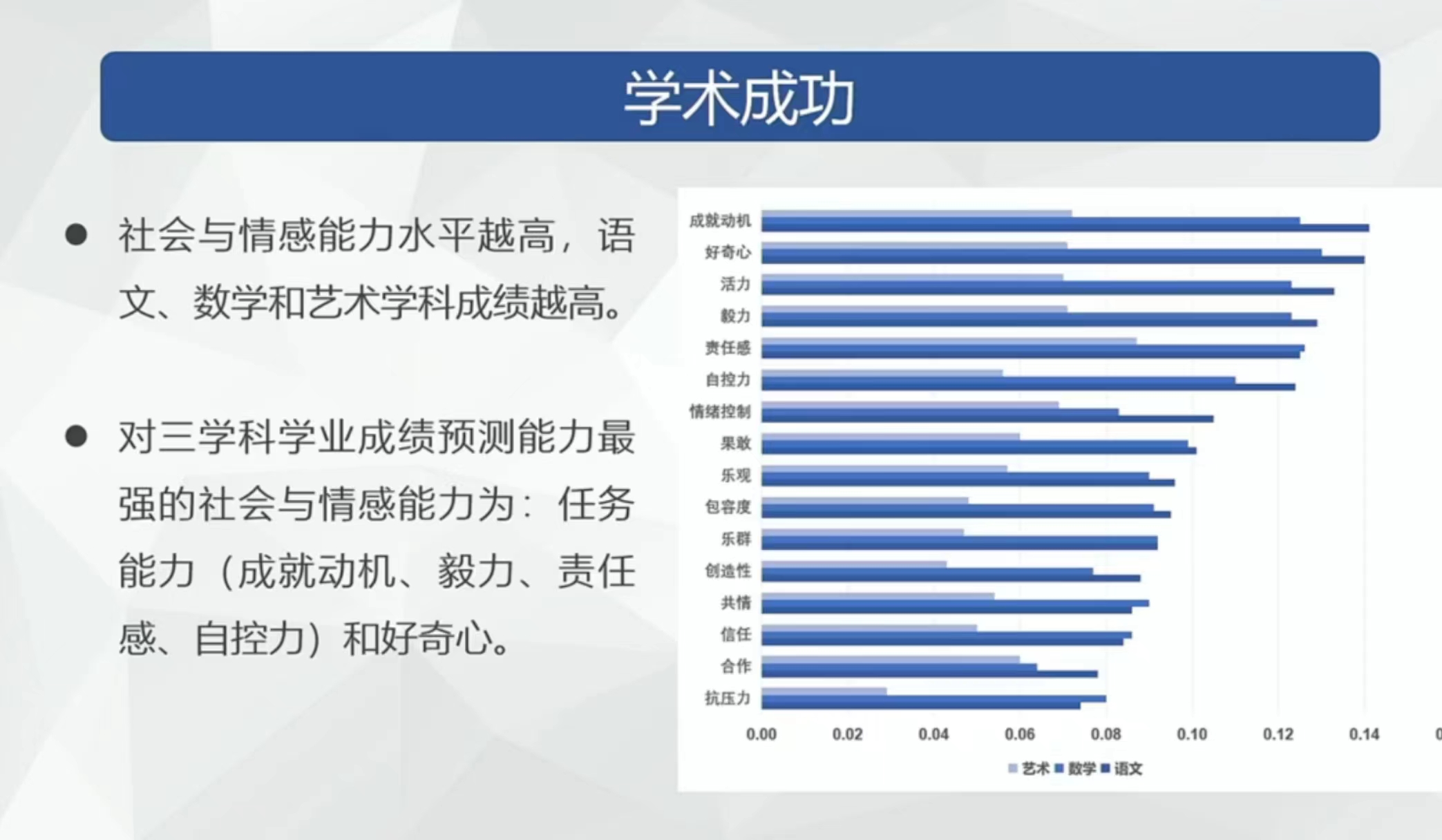 从学业表现上来看,学生的社会与情感能力水平越高,语文、数学和艺术学科成绩越高。对三学科学业成绩预测能力最强的社会与情感能力为:任务能力(成就动机、毅力、责任感、自控力)和好奇心。