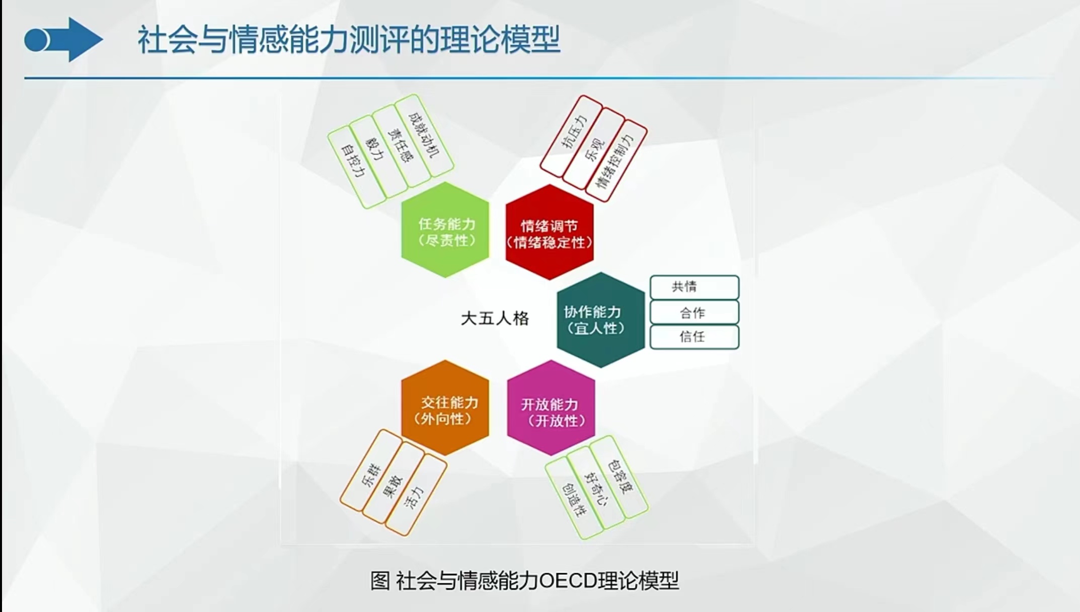 OECD将社会与情感能力定义为:人在实现目标、与他人合作及管理情绪过程中所涉及的能力,包括任务能力(责任感、毅力和自控力)、情绪调节(抗压力、乐观和情绪控制力)、协作能力(共情、合作、信任)、开放能力(包容度、好奇心、创造性)、交往能力(乐群、果敢、活力)。