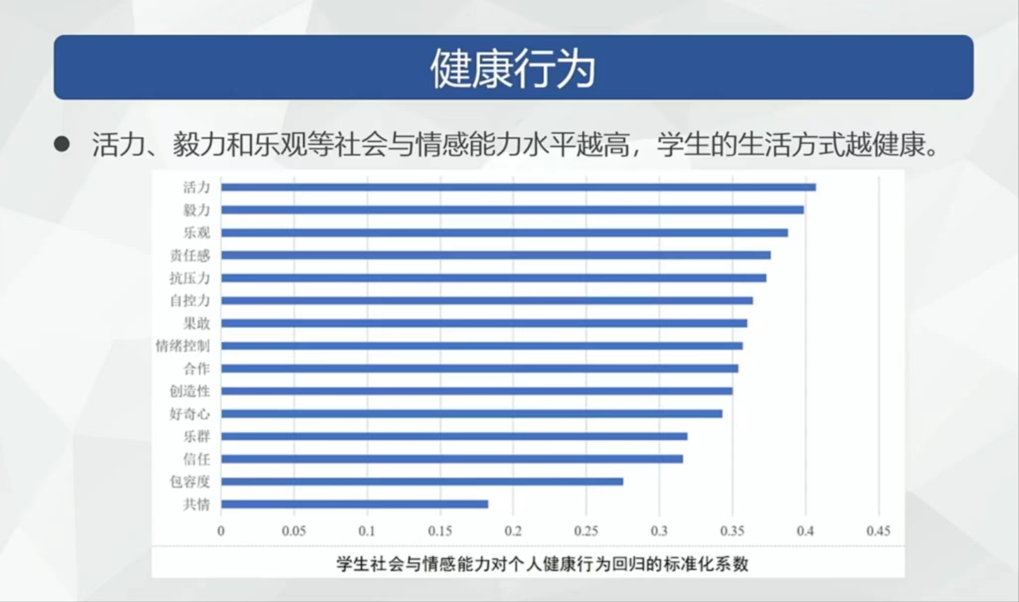 此外,乐观、活力和抗压力等社会与情感能力水平越高,学生的心理幸福感越强。活力、毅力和乐观等社会与情感能力水平越高,学生的生活方式也越健康。