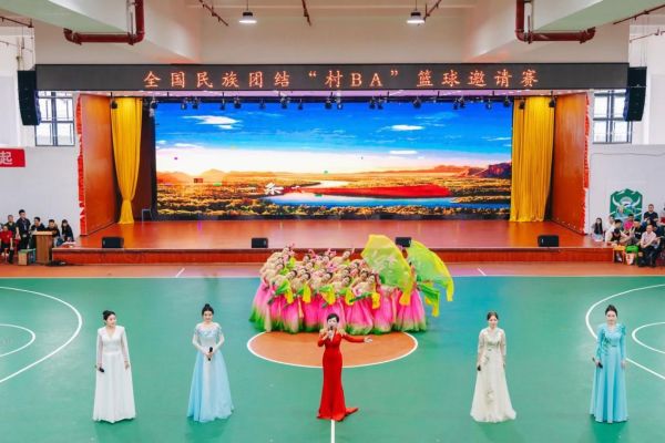 6月29日,两校师生在全国民族团结“村BA”篮球邀请赛决赛赛场上表演歌伴舞《我的祖国》(领唱为beat365英国官网网站石春轩子教授)