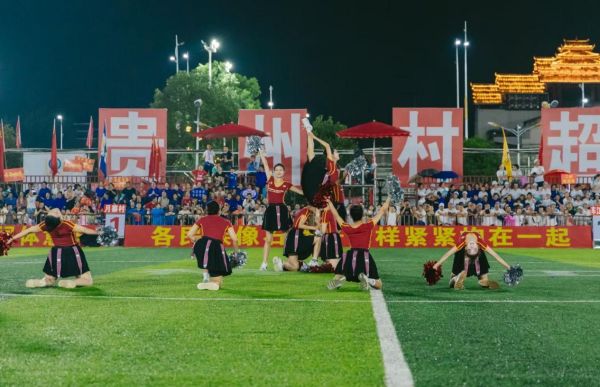 6月29日,贵州师范大学学生在“村超”赛场上表演啦啦操《力》