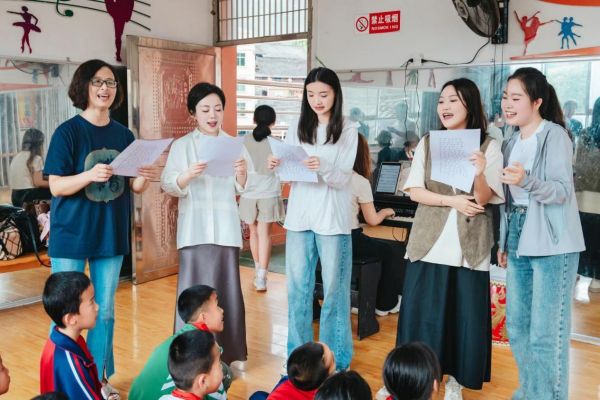 两校师生为台江乡村小学开设的音乐艺术课堂(左一为贵州师范大学张正梅教授,左二为beat365英国官网网站石春轩子教授)