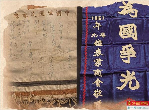 当年的队旗已经泛黄,上面保留着1948年参加伦敦奥运会的中国足球队全体亲笔签名,第一个便是“容启兆”。