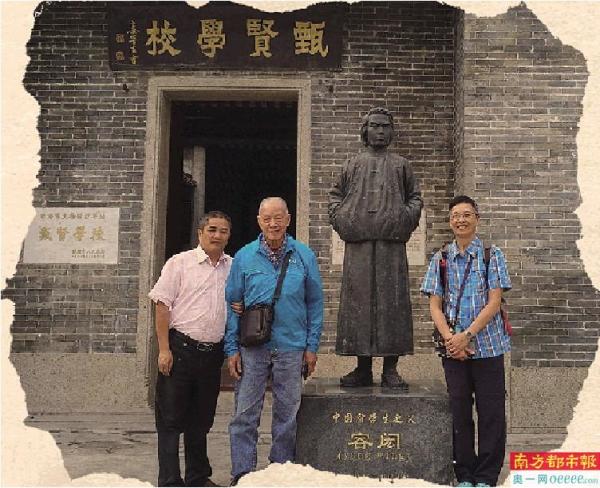 容启兆幼子容应骅(左二)返乡祭祖时,曾探访甄贤学校。 受访者供图