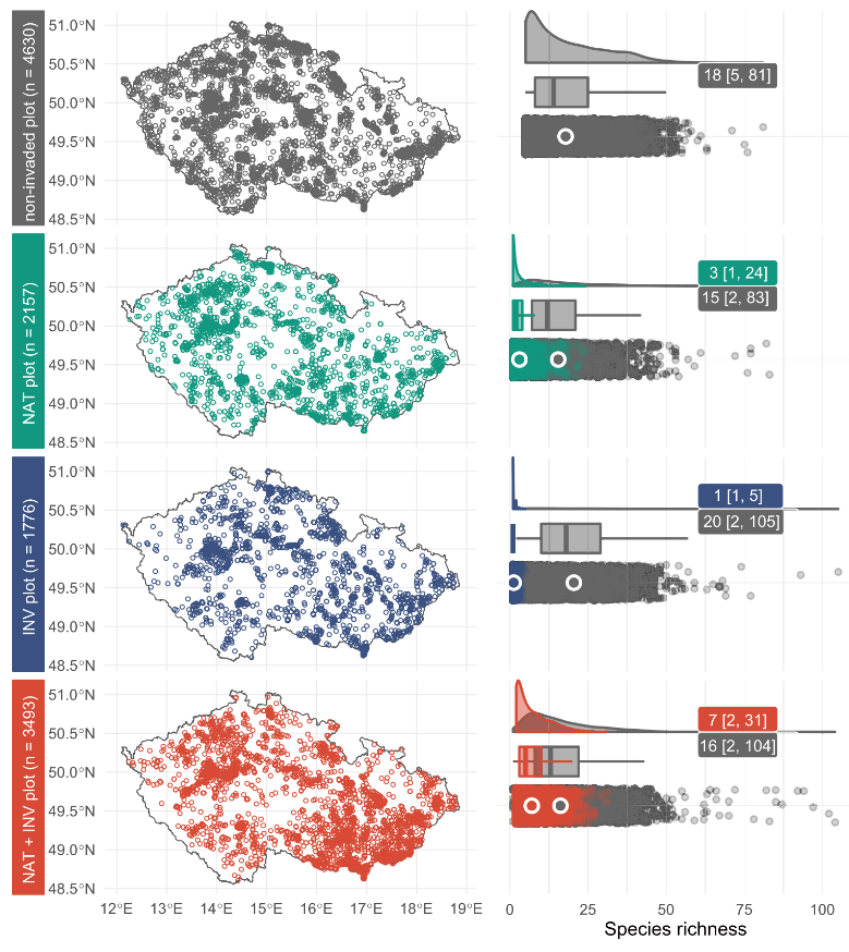 未入侵样方和包含不同入侵阶段外来植物的入侵样方的地理分布。图片来源于《自然—植物》
