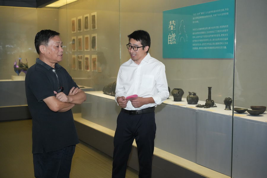 作为本次展出作品的主要创作者之一,宋秋军为前来参观的市民细致地介绍着每一件黑陶作品。2018年,为进一步推广亭林区域“黑陶制作技艺”,扩大黑陶文化影响力,宋秋军在亭林镇红阳村创办上海土源陶瓷科技中心,建立“黑陶文化园”,园内建有黑陶展厅、实践基地、陶土研究及制作工作室,将“亭林黑陶”及其制作技艺带到了大众眼前。2023年4月,亭林黑陶非遗文创园被列为金山区社区教育社会学习点,这让更多市民群众有机会近距离了解并传承黑陶技艺。