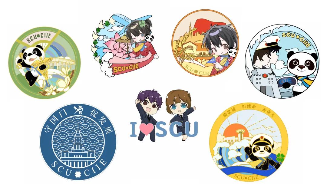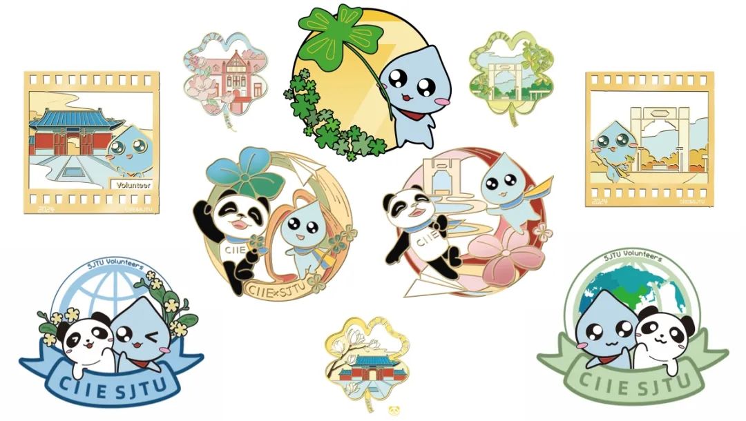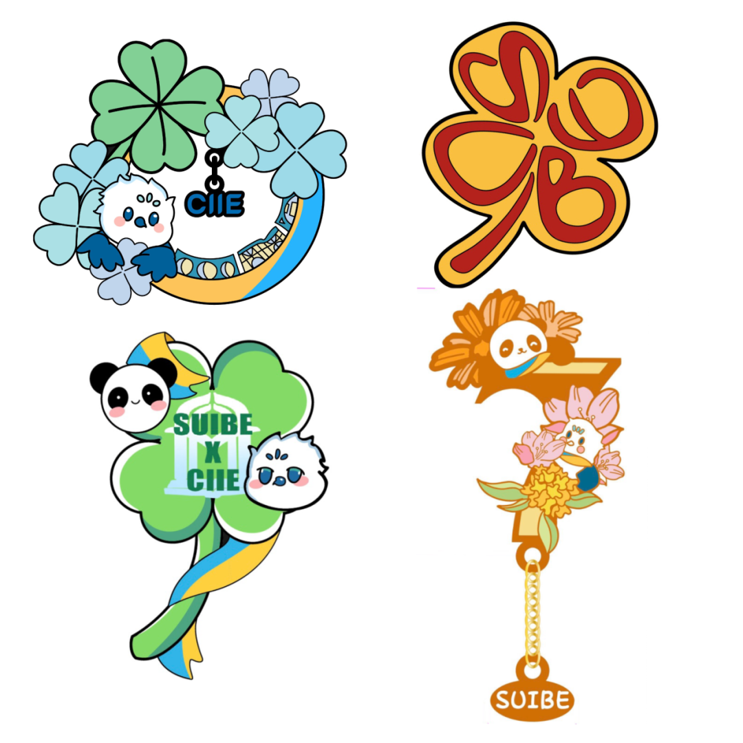 上海对外经贸大学本套徽章共四枚,融合了进博会和学校的英文简称、进宝和学校团委吉祥物“啾团团”,以及校园四季开放的花朵和标志性建筑物。