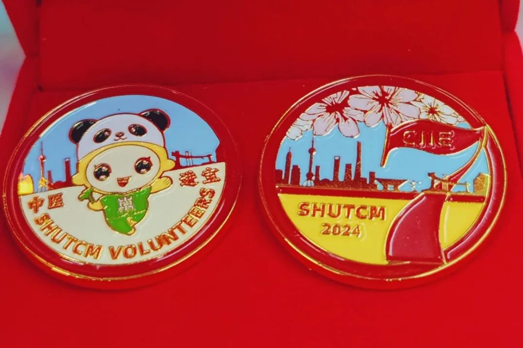 两款徽章表达了上中医“小叶子”将继续用青春蓬勃的志愿力量在世界舞台绽放光彩的决心!
