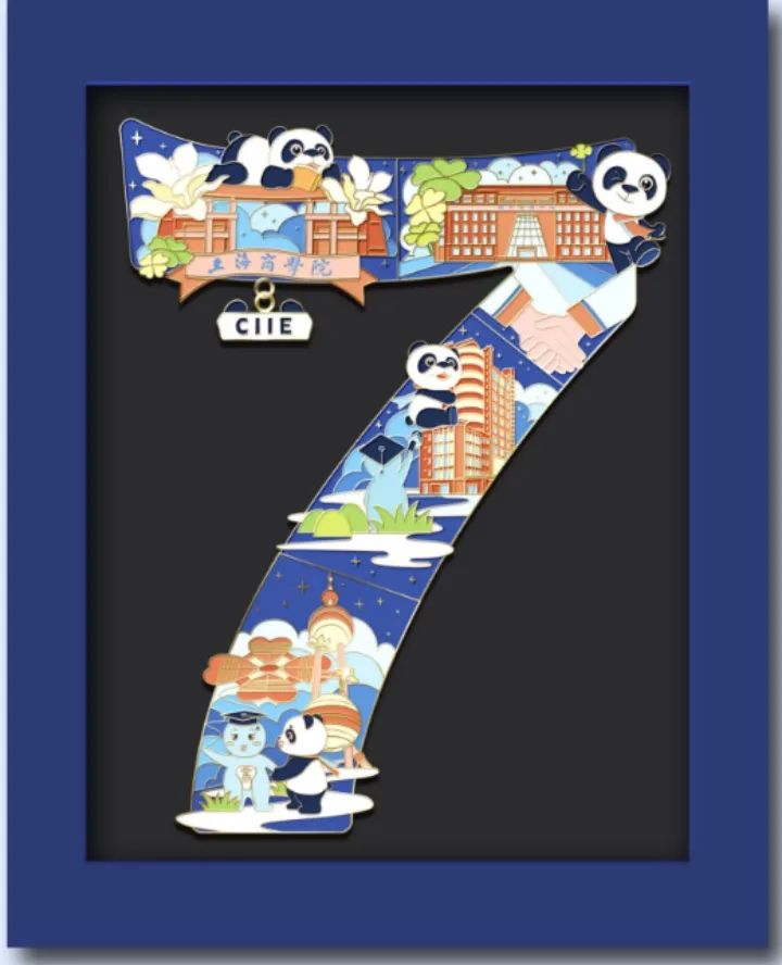 上海商学院第七届进博会徽章用阿拉伯数字“7”作为主视觉元素,并融入了独特的小吊坠设计,增强整体美感与灵动性。