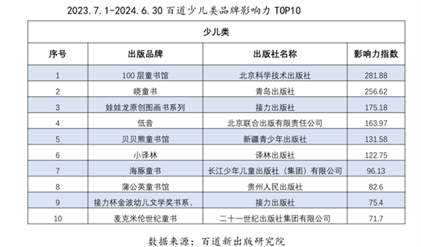 2023年7月1日-2024年6月30日百道少儿类品牌影响力TOP10