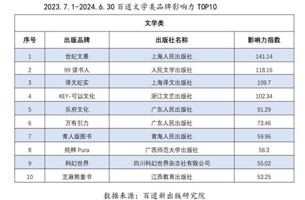 2023年7月1日-2024年6月30日百道文学类品牌影响力TOP10