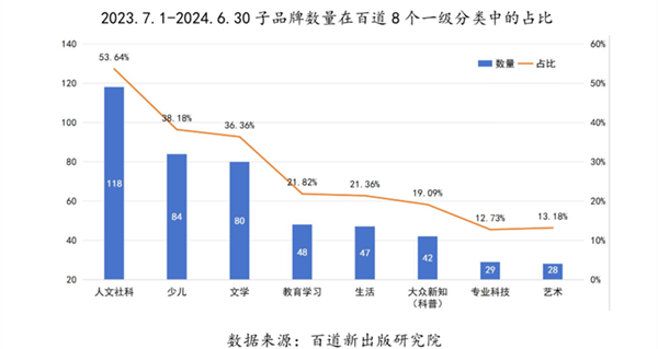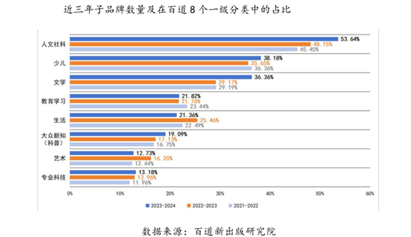 从出版品牌在人文社科、少儿、文学、教育学习、生活、大众新知(科普)、专业科技、艺术这八个百道一级分类的集中度看,人文社科赛道最“卷”。报告期内220个样本品牌中,有118个涉足人文社科类图书,占比超过50%。涉足少儿出版类别的品牌数量占比仅次于人文社科,达38.18%。排名第三的是文学出版方向的品牌,占比为36.36%。