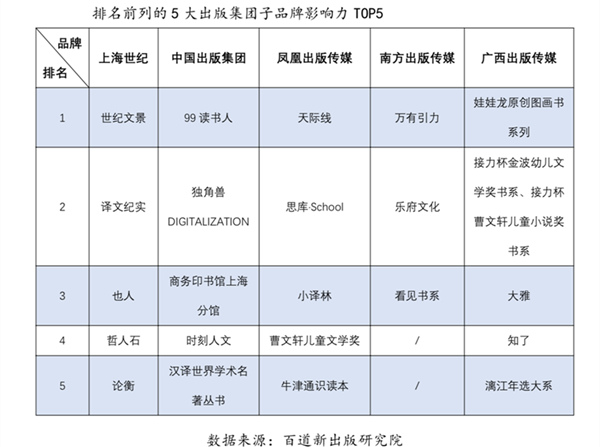 排名前列的5大出版集团子品牌影响力TOP5