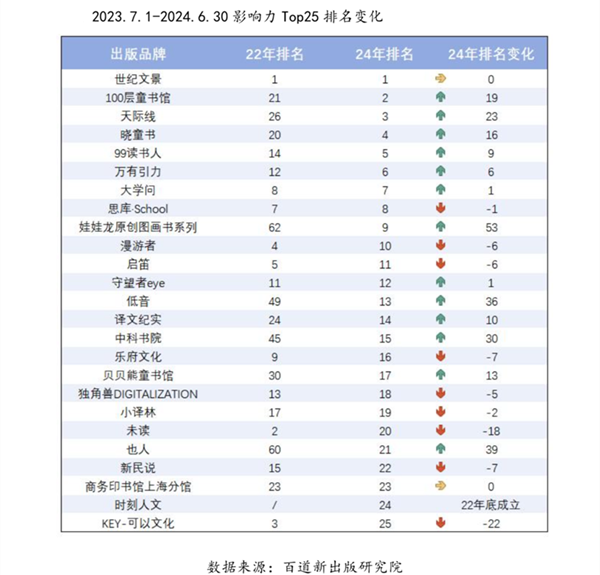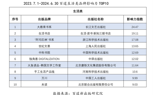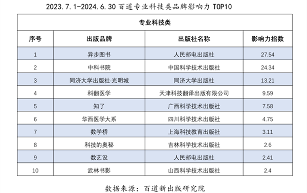 2023年7月1日-2024年6月30日出版品牌影响力出版社/民营公司TOP20