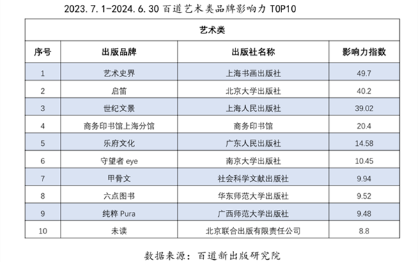 2023年7月1日-2024年6月30日百道艺术类品牌影响力TOP10