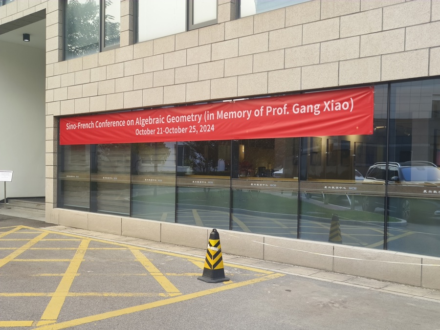 中国科学院晨兴数学中心外,张贴着“中法代数几何学术会议”的条幅。 周昱帆 摄