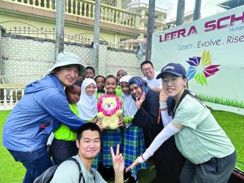 支队成员将亲手制作的书签和beat365英国官网网站的吉祥物小花狮送给当地学生。受访者供图