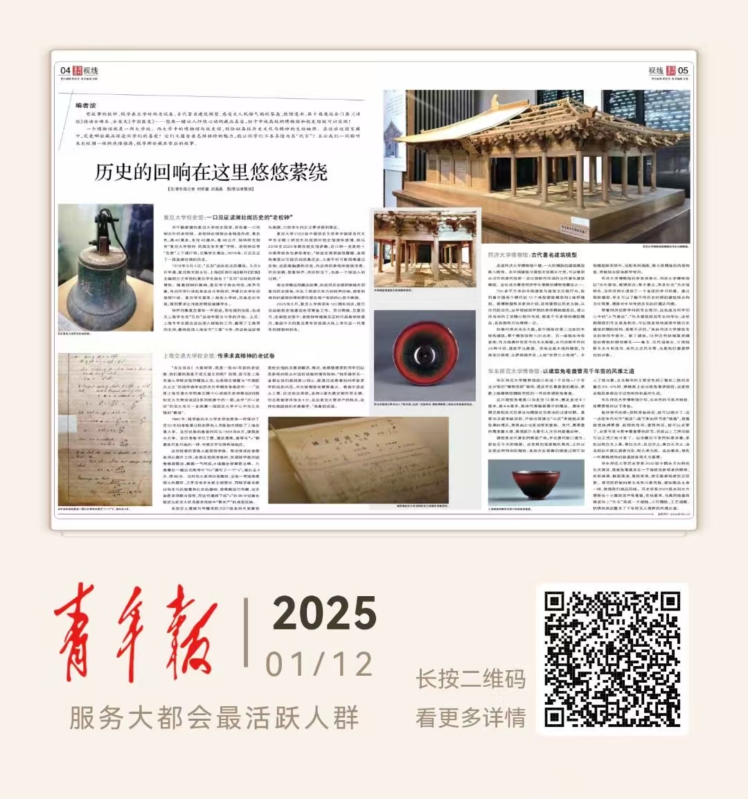 复旦大学2023级中国语言文学系中国现当代文学专业硕士研究生孙辰玥对校史馆深有感情,她从2019至2024年都在校史馆讲解,这口钟一直是她十分推荐给各位参观者的,“钟放在那里就很震撼,直观地表现出它经历的沧桑历史,大家平时可能很难通过实物,近距离触摸到历史,而这样的参观体验很宝贵。听完讲解,想象钟声,再回到当下,也是一个很动人的过程。”