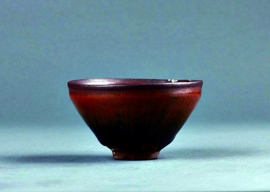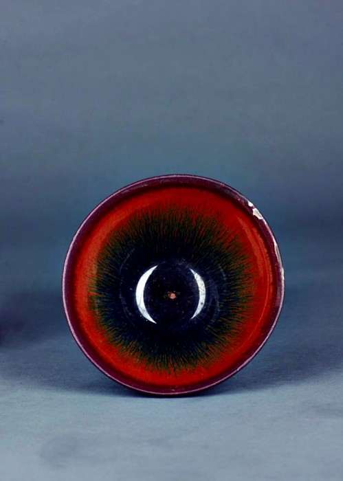 建窑是宋代著名的黑瓷产地,早在唐代就已建立,窑址在今天的福建。这里烧的瓷盏釉色黑亮,之所以呈现这种特别的釉色,是因为在瓷器的烧造过程中加入了铁元素,且当釉中的主要呈色剂三氧化二铁的含量在5%~6%时,黑釉面上会出现兔毫状斑纹,这是铁在釉层表面由于过饱和而析晶所生成。
