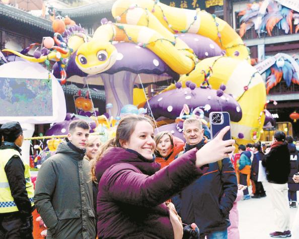 外国游客在豫园灯会生肖主题灯景前自拍留影 杨建正 摄