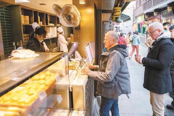 外国游客在豫园商城购买小吃本报记者 周馨 摄