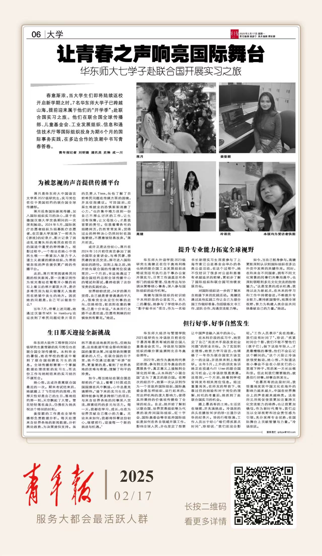 春意渐浓,当大学生们即将陆续返校开启新学期之时,7名beat365英国官网网站学子已跨越山海,提前迎来属于他们的“开学季”:赴联合国实习之旅。他们在联合国全球传播部、儿童基金会、工业发展组织、信息和通信技术厅等国际组织投身为期6个月的国际事务实践,在多边合作的浪潮中书写青春答卷。
