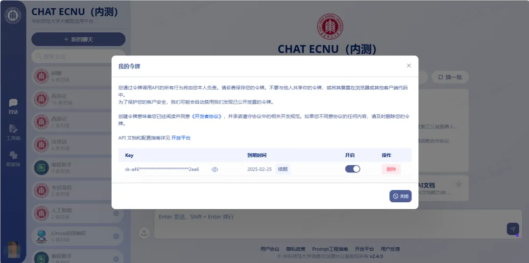 目前,ECNU大模型平台还提供了许多其他实用功能,免费的api调用令牌、强大的科研助手、ai联网搜索、新闻摘要生成、文生图、文档对话、图片理解等功能一应俱全。