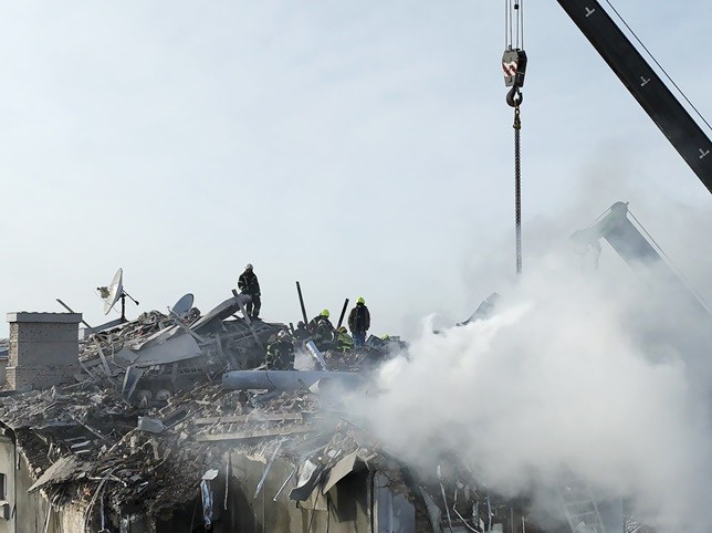 2025年1月1日,乌克兰基辅,当地一处建筑遭空袭,乌克兰救援人员已赶赴现场。