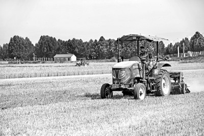 山西省襄汾县燕村智慧农业示范基地,农机手驾驶播种机械在播种玉米。李现俊摄/光明图片