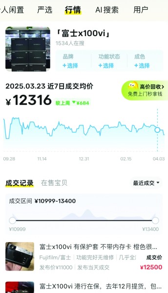 二手市场情况同样热烈,根据闲鱼行情显示,二手大疆pocket近七日成交均价为3400元,和原价基本持平,此前一周,二手均价甚至近4000元。而二手富士X100Ⅵ近七日成交均价为12316元,高出原价近千元。