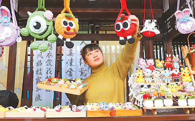 浙江省台州市路桥区十里长街,摊主在售卖编织的毛衣卡通玩偶。蒋友青摄(人民视觉)