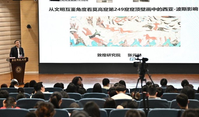 首场讲座特邀敦煌研究院副院长张元林教授主讲,既是对王元化先生的缅怀,也是对“大中文”理念的践行。王元化学馆馆长方笑一教授主持,讲座主题为《从文明互鉴角度看:莫高窟第249窟窟顶壁画中的西亚-波斯影响》,聚焦莫高窟第249窟,揭示北魏时期敦煌壁画中隐藏的西亚-波斯文明印记——窟顶东披“有翼天人守护莲华摩尼宝珠”脱胎于西亚“天神护佑圣树/太阳”传统,西披天宫建筑的凸形雉堞模仿波斯神庙形制,北披“反身射虎”“掷矛刺兽”场景再现波斯王族彰显权威的“皇家记忆”,而“执风巾畏兽”式风神则融合地中海-西亚文化元素。