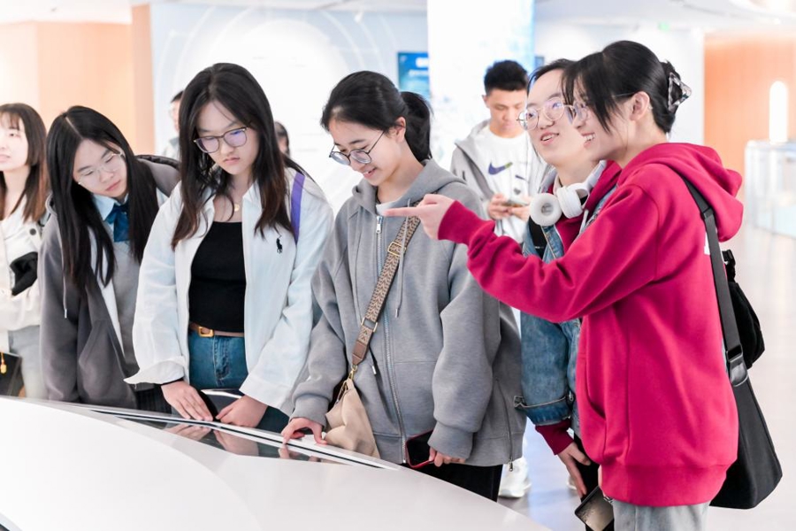 上海的行程中,探索人工智能发展无疑是其中最让人热血沸腾的一站。站在滴水云厅规划展示中心的LED弧形数字长卷前,自贸试验区的宏观布局与发展脉络徐徐展开。包括全息数字人的专属讲解、可触摸的水滴艺术装置、超大型实体融合的数字沙盘等在内,学生们沉浸式感受临港的崛起之势。