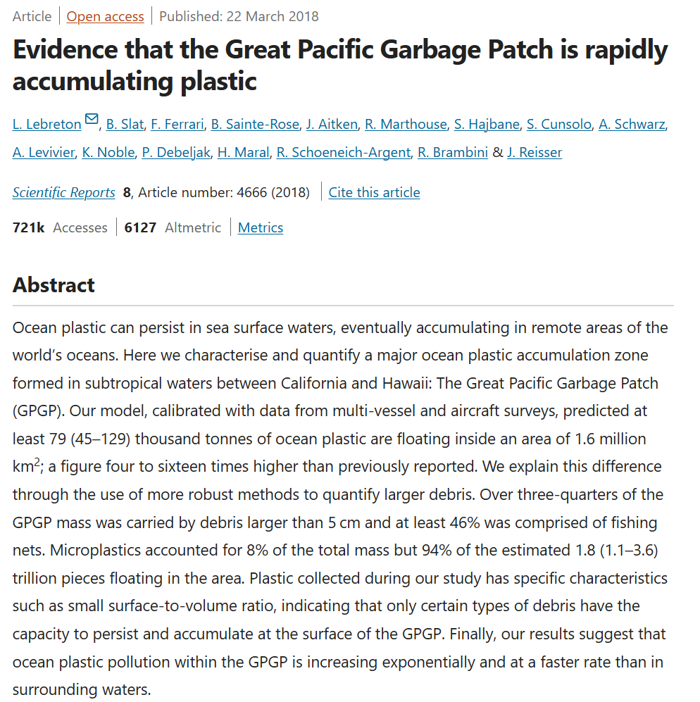 2018年,“海洋清理”的研究人员在《自然》杂志发表的文章标题和摘要截图。