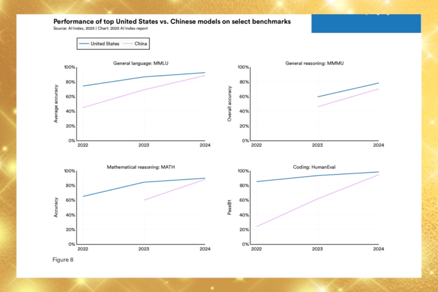 2025年斯坦福的人工智能报告显示,中美AI部分基准测试上的性能差距到2024年底只有10%