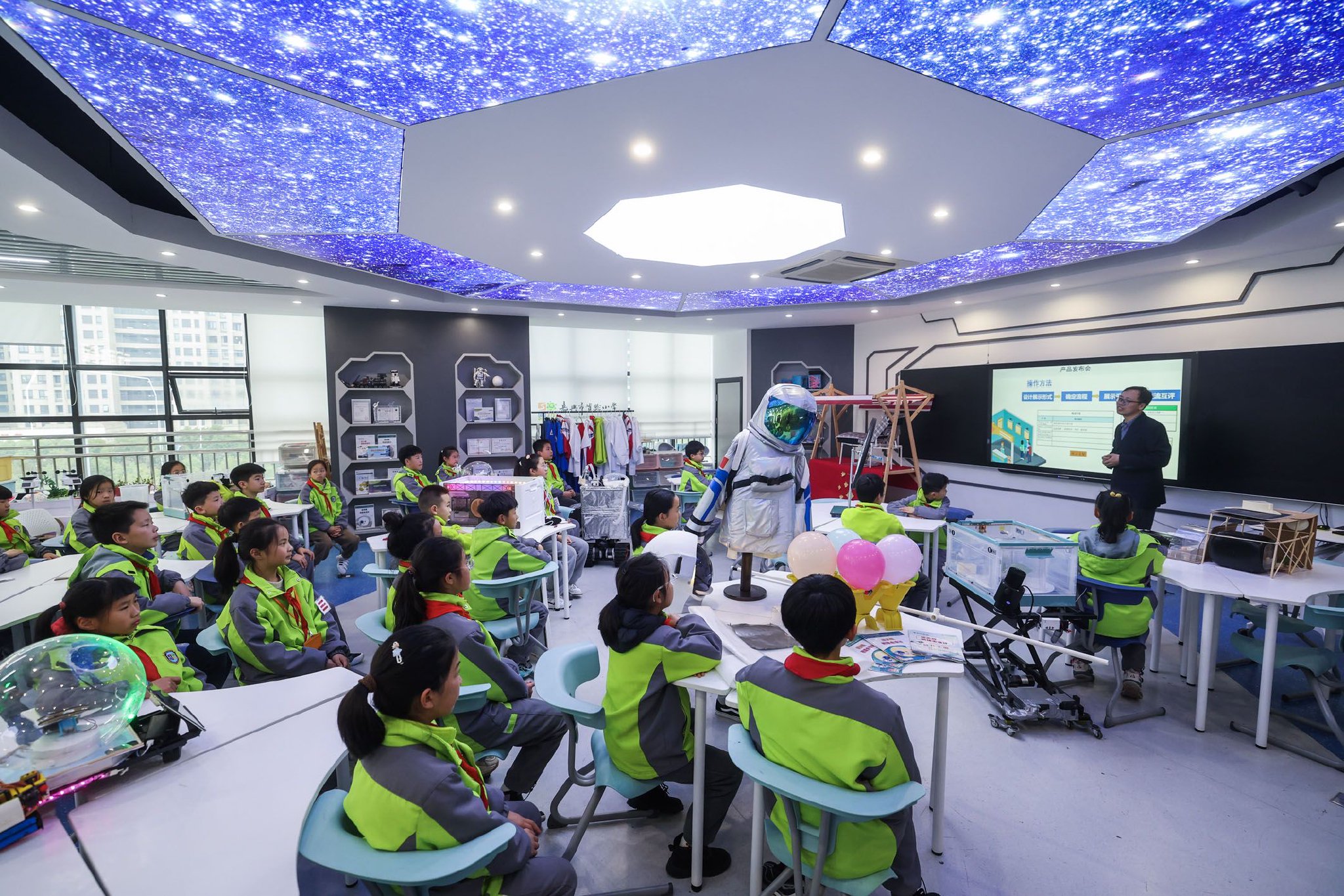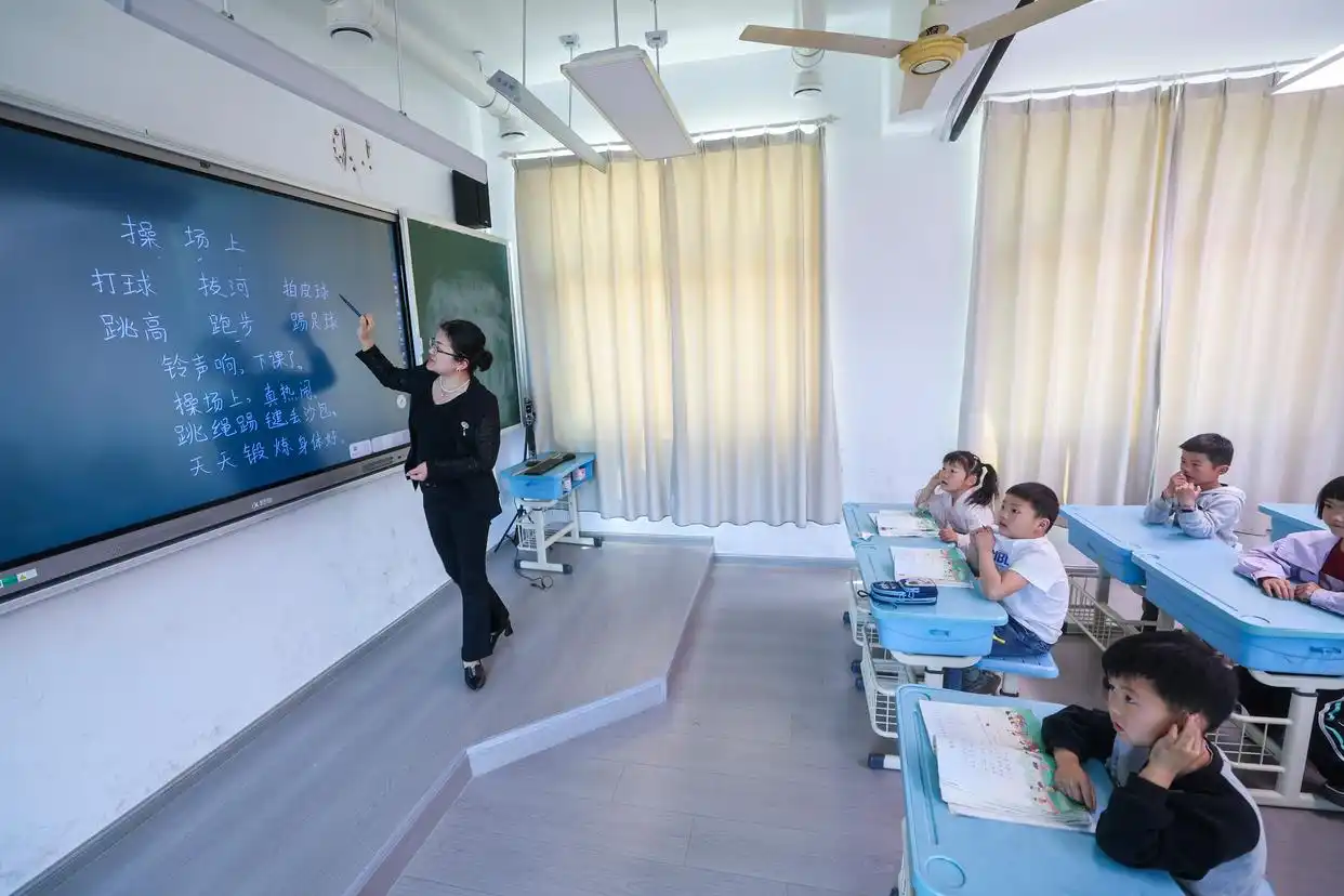浙江省嘉兴市实验小学科技城校区内,老师在指导学生完成“AI赋能生活”项目化学习。新华社发