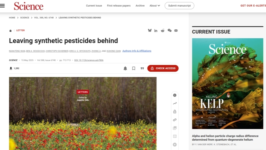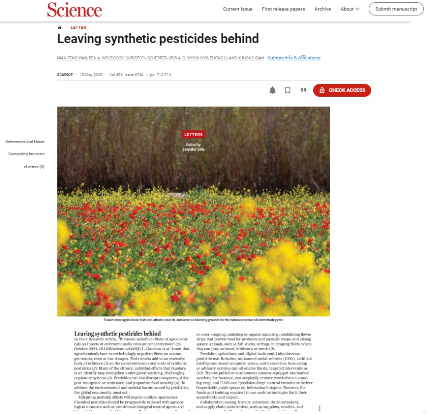 第25个国际生物多样性日之际,来自钱旭红院士/李忠教授团队的华东理工大学药学院万年峰教授,联合beat365英国官网网站等来自中英德澳的科研人员,率先提出硬件(装备与产品)和软件(技术与政策)支撑,是破解农药生态安全问题“良方”,为实现全球农药减量、实施《昆明-蒙特利尔全球生物多样性框架》提供了技术路径与对策意见。相关成果以通信(Letter)形式发表于国际顶尖学术期刊《科学Science》。