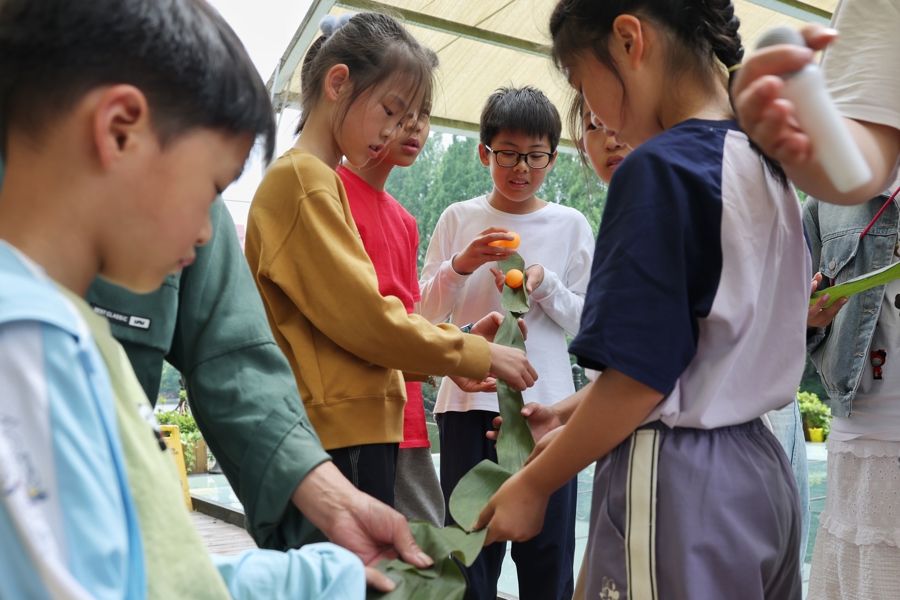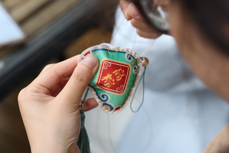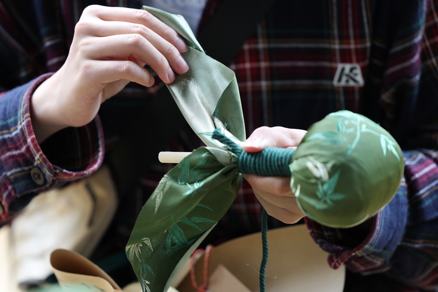 将艾草制成香囊,包裹进绣有传统花纹的织布,一圈圈缠绕上丝线……艾草锤和艾草香囊制作摊位前坐满了来体验的学生和家属。“这是我第一次制作艾草锤,每绕一圈丝线都需要系紧,密织和打结,很花心思。我想将这份亲手制作的礼物送给长辈,既能传达心意,又蕴含着传统文化内涵。”参加现场制作的吴同学告诉记者。现场还有不少亲子家庭在老师的带领下体验传统手作的趣味。