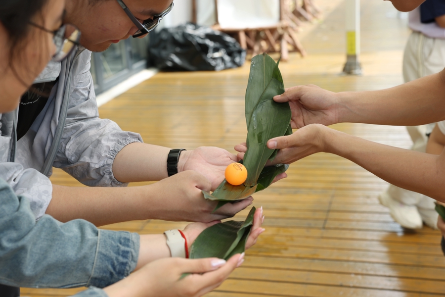 台湾青年学生在活动上协力完成“粽叶运乒乓”。