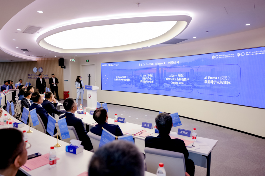 这一基座之上,金融智能体家族“SAIFS-F4”可谓“四兄妹”,包括AI Jason(思睿,金融分析师智能体)、AI Alex(律衡,风控与合规模型治理智能体)、AI Jay(观微,政经宏观分析师智能体)、AI Emma(织元,数据科学家智能体)。这一金融智能体系列,重构了金融中后台的知识劳动逻辑,构成了新智能金融系统中的“数字协作者群”。