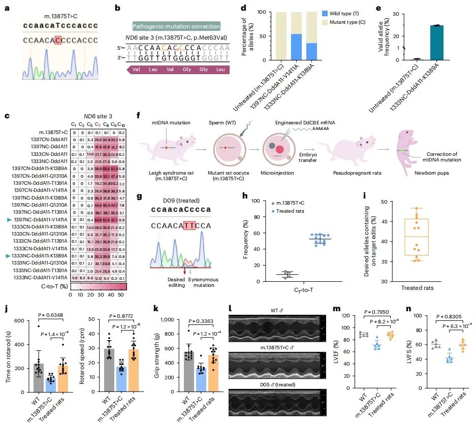 进一步地,研究人员将最优的DdCBE变体注射到近乎纯合突变的Leigh综合征大鼠模型的受精卵中。结果显示,平均53%的致病mtDNA被成功纠正回正常状态,且高效精准的体内编辑使得Leigh综合征大鼠模型的肌肉和心脏功能改善至野生型大鼠水平。
