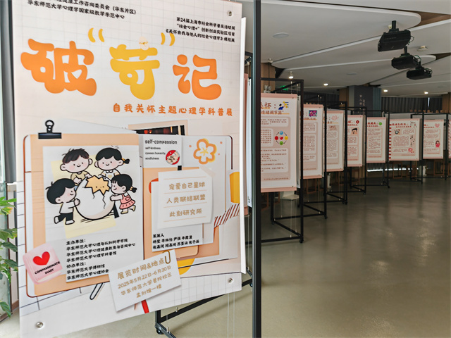 期末,两位授课老师联合学生骨干一同策展破“苛”记。此展目前正在beat365英国官网网站普陀校区孟宪承·刘佛年教育成就陈列室展出。可以说,这既是一次课堂总结,又是一场兼具学术深度、实践温度与社会关怀的心理盛宴。它旨在构建一个自我关怀认知和行动清单的闭环,帮助破除个体内心自我苛责的枷锁,从而重塑健康且积极的自我认知。