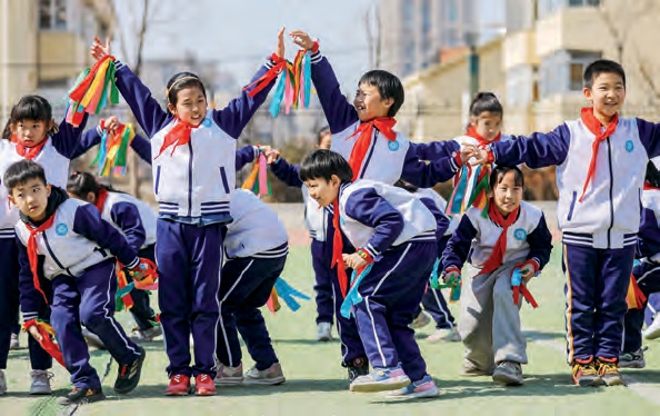 孩子在户外活动的机会越来越少。图为山东省青岛市一所小学,学生在课间玩“穿针引线”游戏。