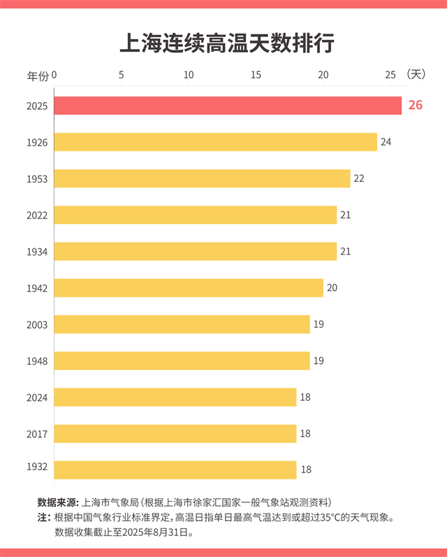 早晨七八点钟的光景,阳光已灼热得不行。8月31日,上海毫无悬念又迎来高温的一天。本轮自8月6日开启的连续高温已持续长达26天,并在前一天已打破1926年连续24天的历史纪录。至此,上海今年8月中下旬实现高温大满贯,且总共27个高温日也创下了8月最多高温日的纪录。